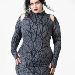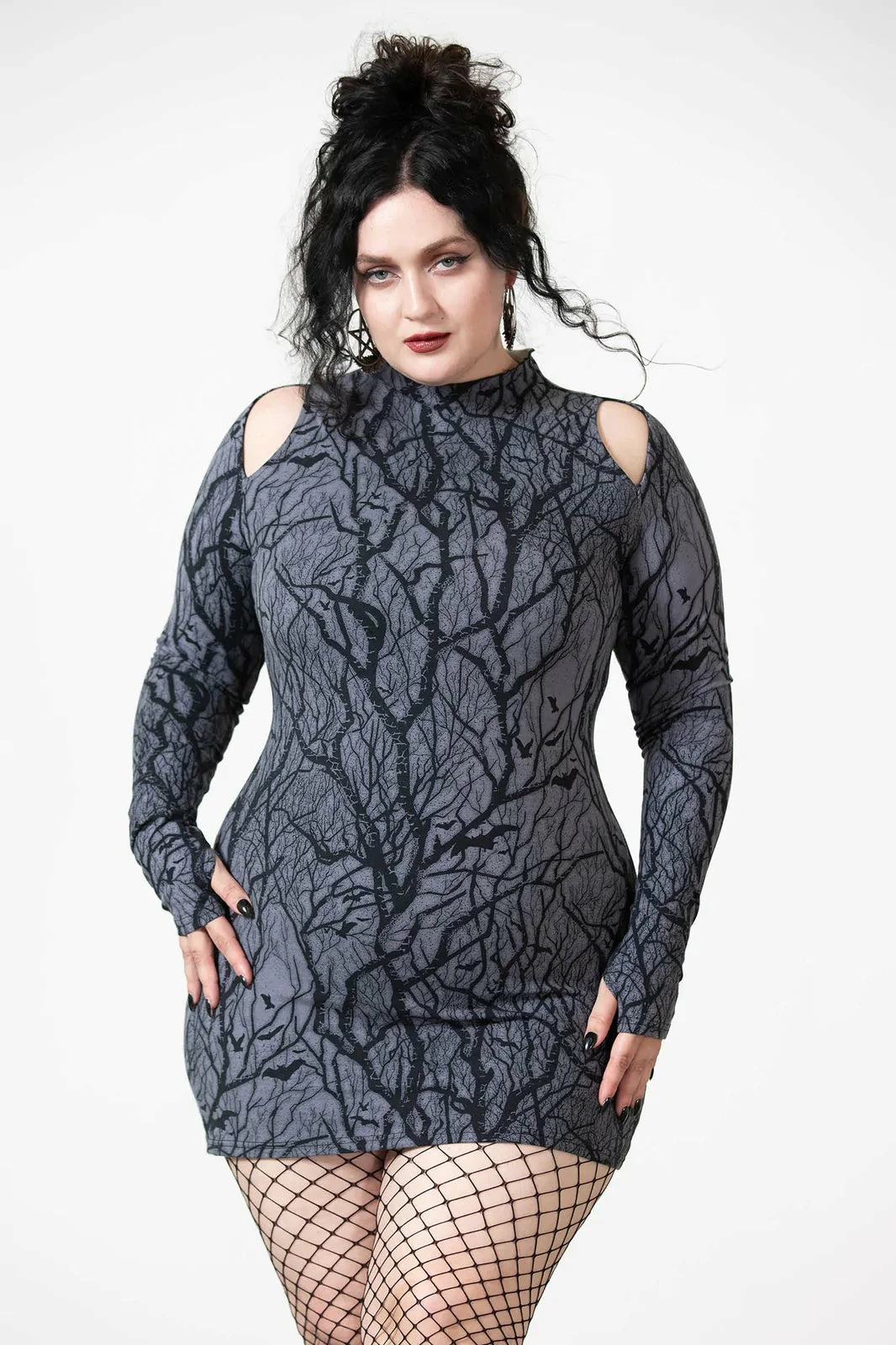 Sexy black and gray bodycon mini dress with a statement contrast print that evokes a bleak winter woodland forest landscape from Killstar. This stunning short dress / longline top is made from a super stretch cotton fabric with high neck, shoulder cut outs and long sleeves with thumbholes. Can be worn as a long top or a mini dress and looks amazing worn with high heels or chunky boots!