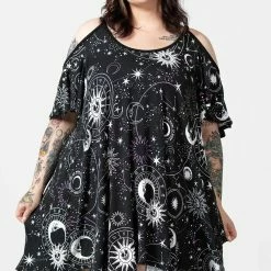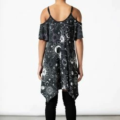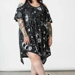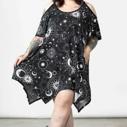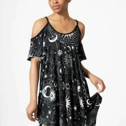 Playful and stylish black sleep dress from Killstar with bold contrast white gothic celestial pattern! This must-have night dress is made from a soft stretchy fabric with cold shoulders, relaxed fit and hanky hem for a comfortable yet flattering silhouette! The perfect thing for lounging or sleeping in style!