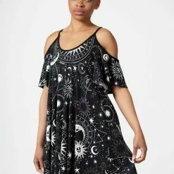 Playful and stylish black sleep dress from Killstar with bold contrast white gothic celestial pattern! This must-have night dress is made from a soft stretchy fabric with cold shoulders, relaxed fit and hanky hem for a comfortable yet flattering silhouette! The perfect thing for lounging or sleeping in style!