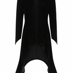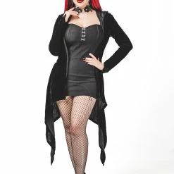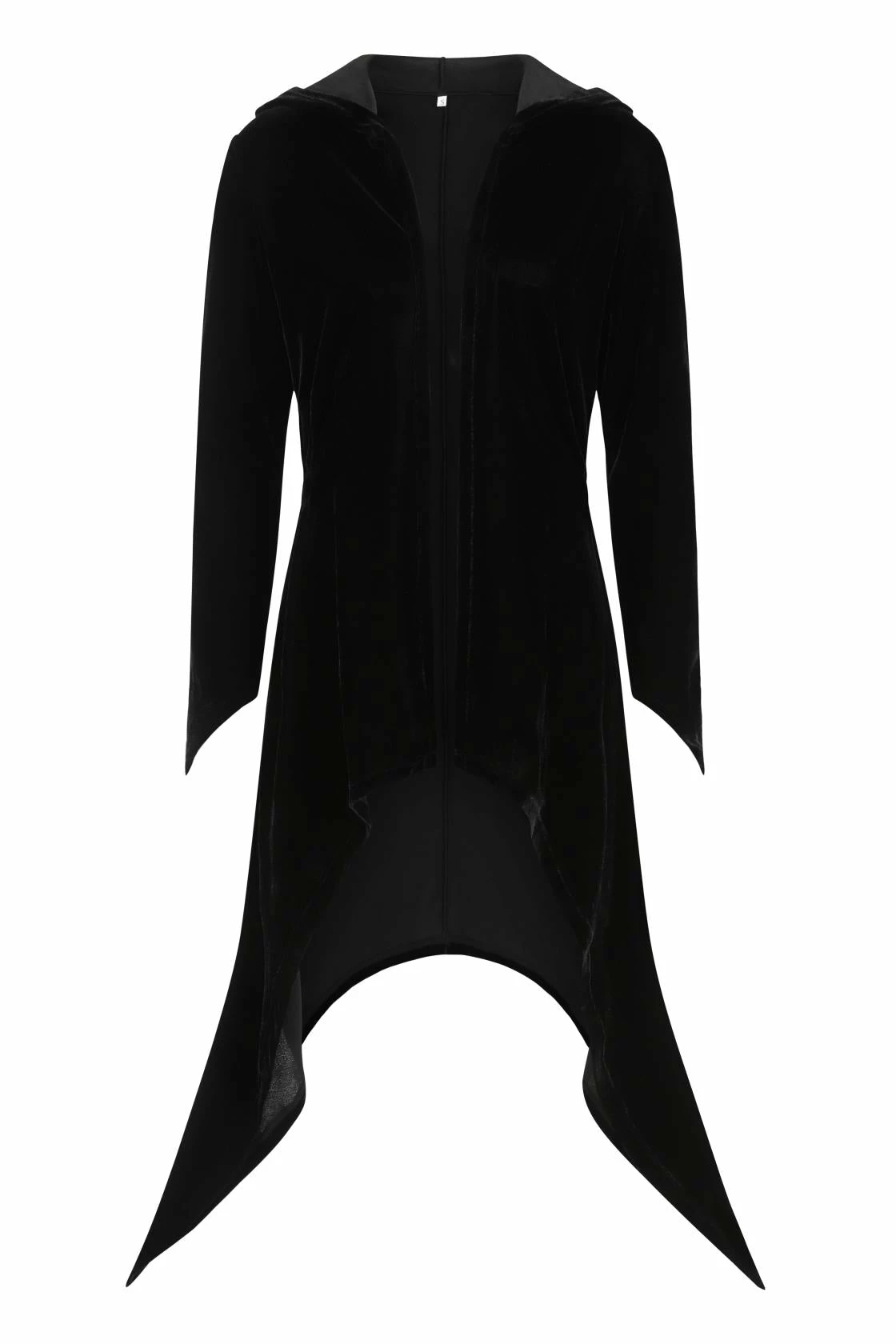 Stunning velvet cardigan from Necessary Evil featuring an oversized hood, long sleeves with pointed cuffs and an irregular high-low hemline. A perfect extra layer, this soft velvet cardi hangs open to show off your awesome attire underneath.
