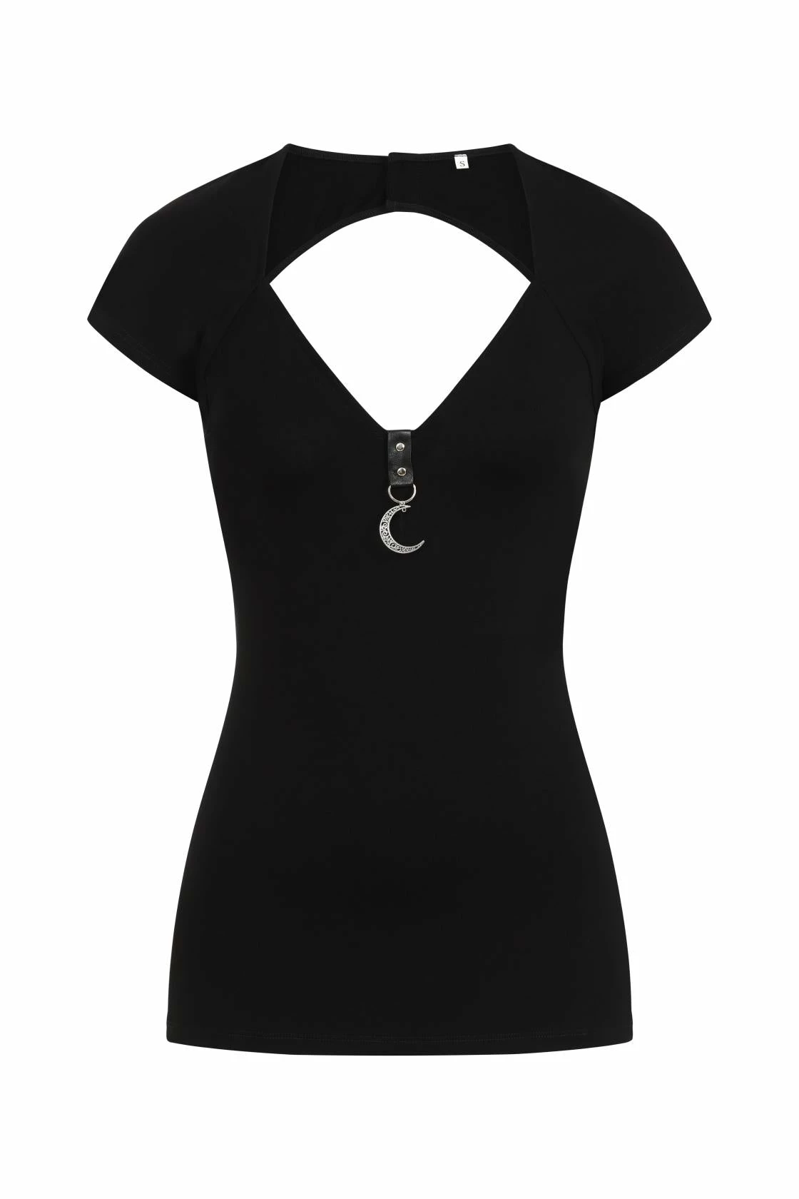 Lovely versatile top from Necessary Evil featuring a V-neck with short faux leather riveted strap with a filigree patterned crescent moon adornment and cap sleeves. Fastening at the back of the neck, this cute top has an eye-catching cut-out back and is perfect day or night.