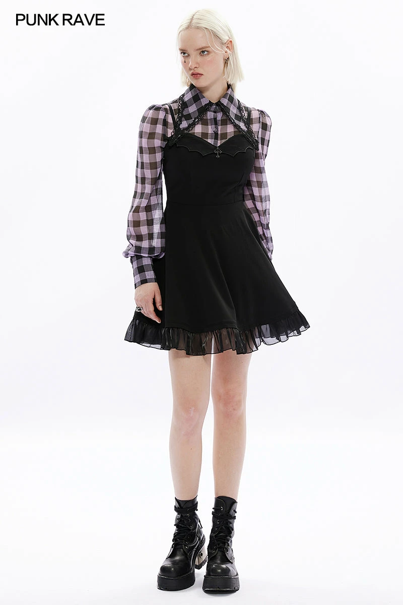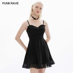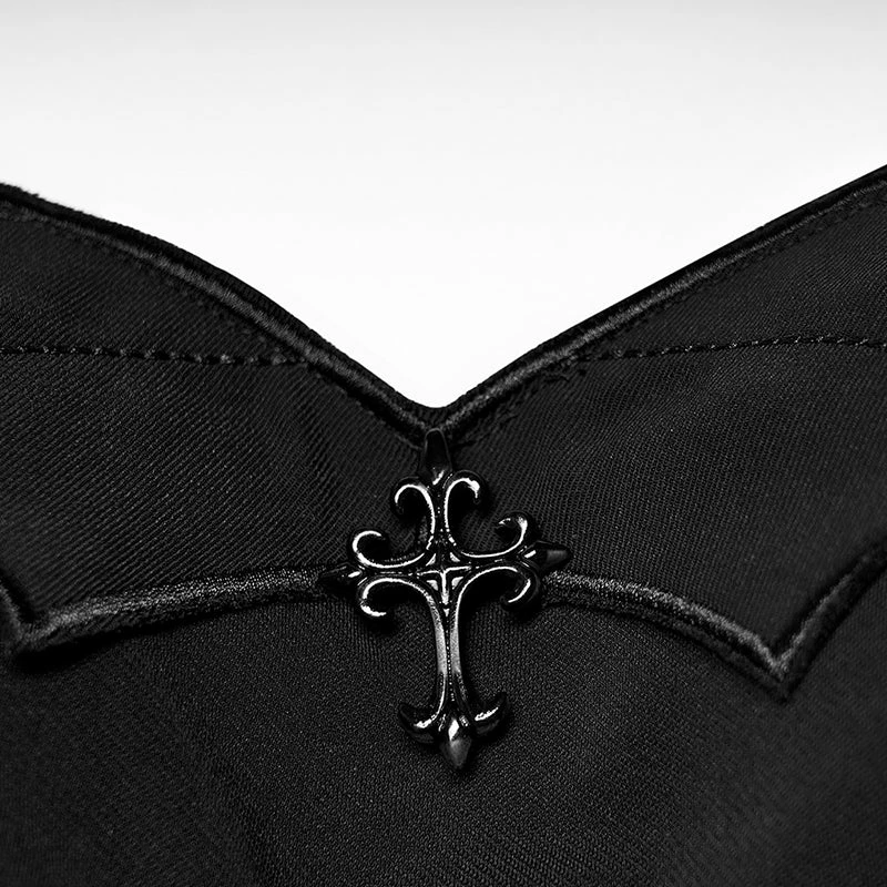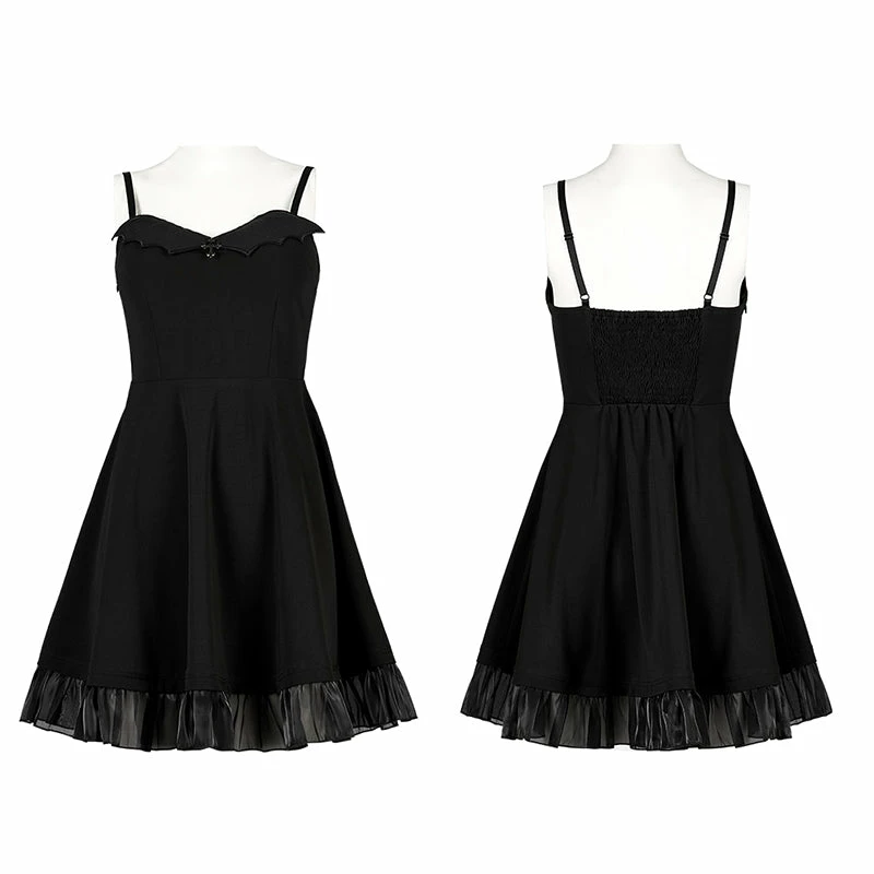 Gorgeous black mini dress dress from Punk Rave made from a soft fabric for comfort and style. This beautiful sleeveless dress is the perfect party dress with thin straps, sweetheart neckline with batwing collar and black metal crucifix. This lovely dress cinches in at the waist with a flowing skater style skirt and ruffled hems.