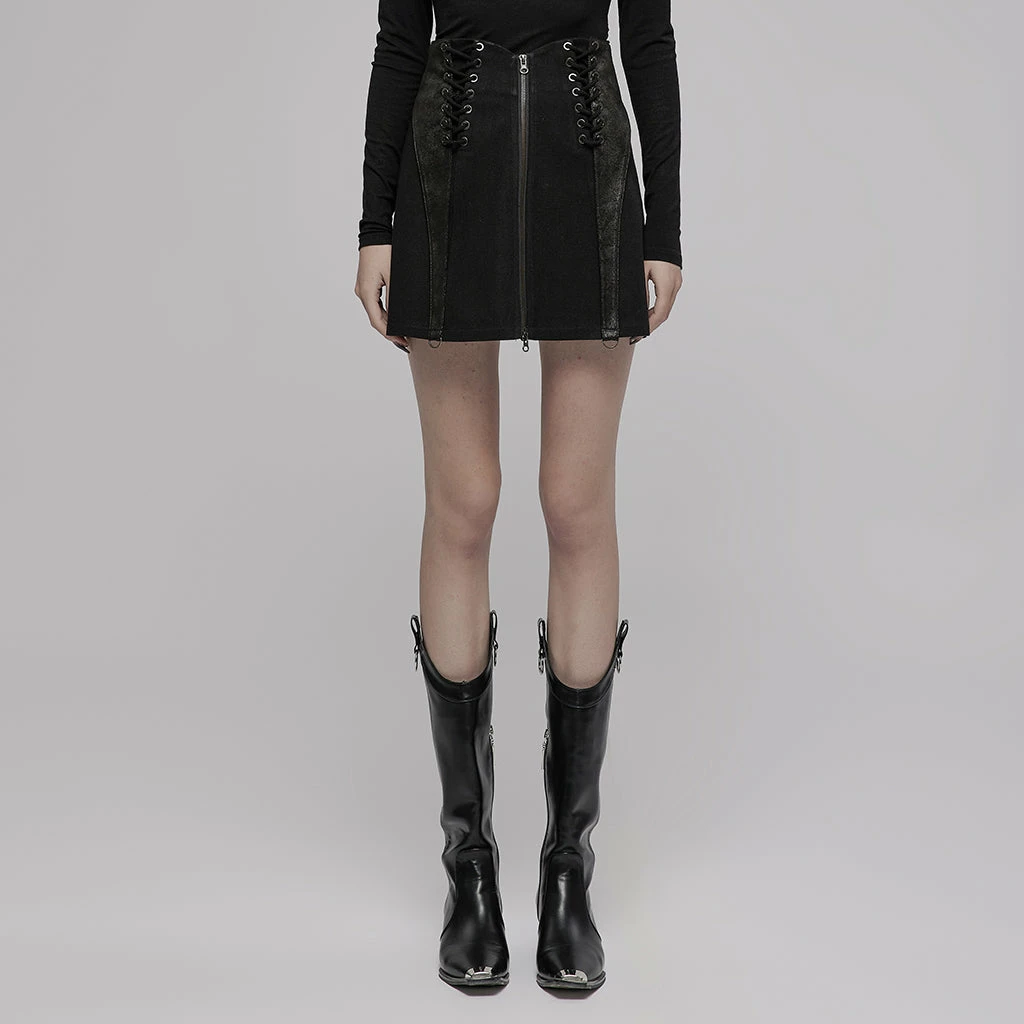 Striking black mini skirt from Punk Rave. This skirt features a high waist, back pocket and full front zip. This stunning mini skirt also features black lace up detailing and metal D rings on faux leather panels for added visual impact!