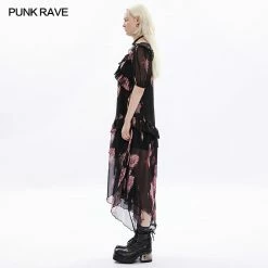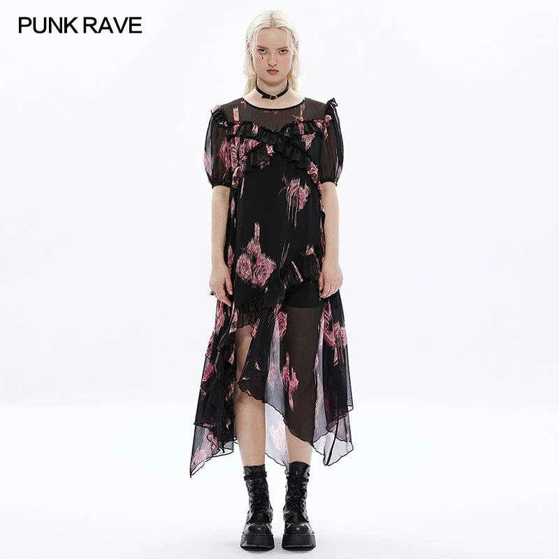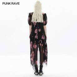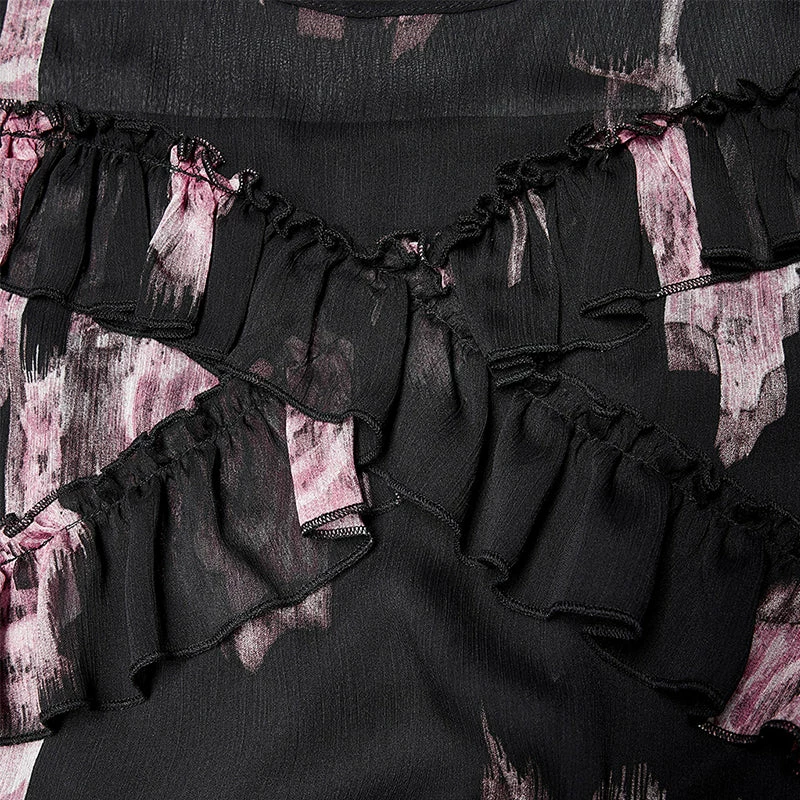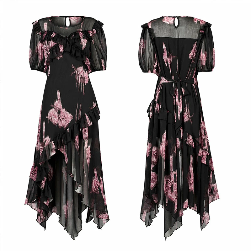 Elegant and floaty black and pink maxi dress from Punk Rave made from a soft layered mesh fabric for comfort and style. This beautiful short length sleeve dress looks stunning whatever the occasion with tie back and ruffled neckline. This lovely dress features a flattering loose fit with hanky hems and opaque lining.