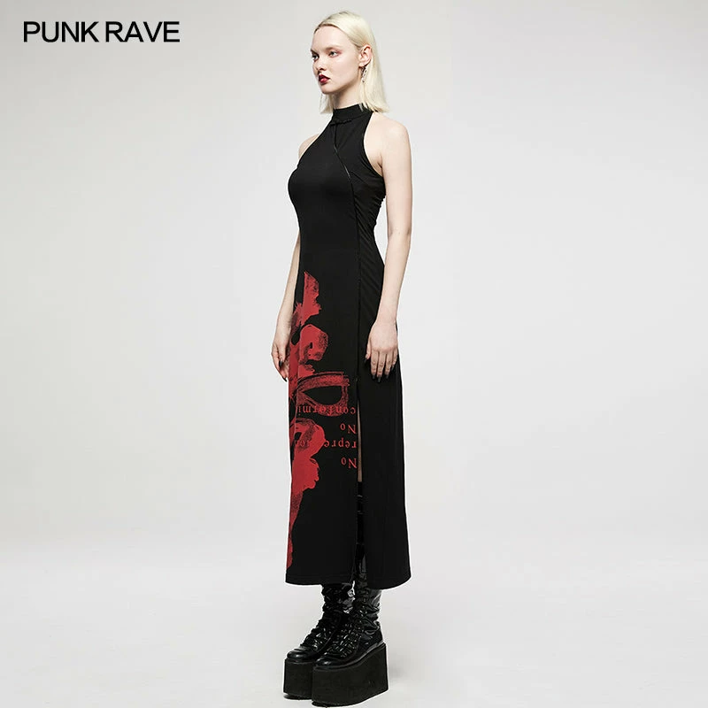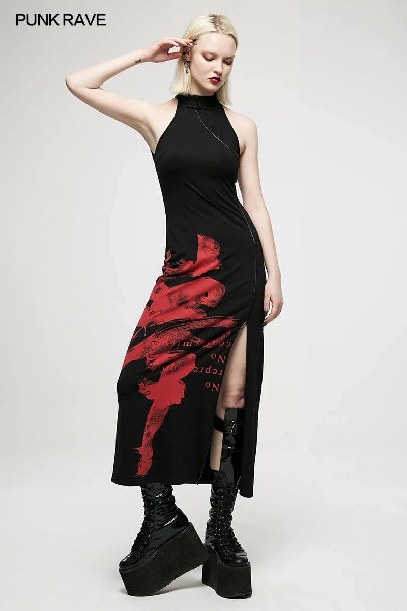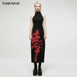 Striking Chinese inspired dress from Punk Rave featuring a sleeveless design and contrasting red print. Fastening with press studs and frog button, this figure hugging dress looks great on. For the perfect fit and fabric composition, please see Punk Rave’s size guide in the images.