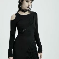 The beautiful figure-hugging Farren dress from Punk Rave features a round neckline and cold shoulder detail to one side. With an asymmetric wrap effect design and adjustable buckle, the net panel overlay adds texture to this awesome dress. For the perfect fit please see Punk Rave’s size guide in the images.