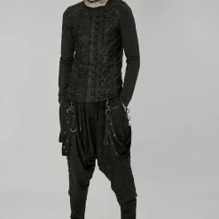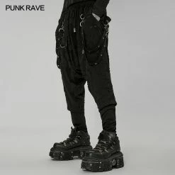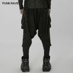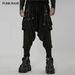 Relaxed fit low crotch black trousers from Punk Rave. Made from a soft textured fabric featuring a statement gathered distressed effect, these trousers look amazing on. Easy to match with anything with strap detailing and ankle cuffs
