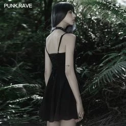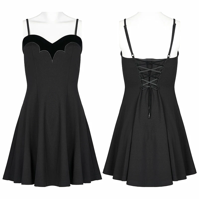Stunning black mini dress from Punk Rave with bat wing style neckline. This lovely dress is made from a soft flowing fabric with a zip closure on the back and adjustable lace up on the back for a smooth silhouette and a flowing feminine skirt.