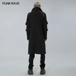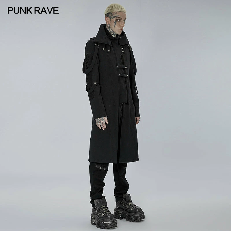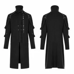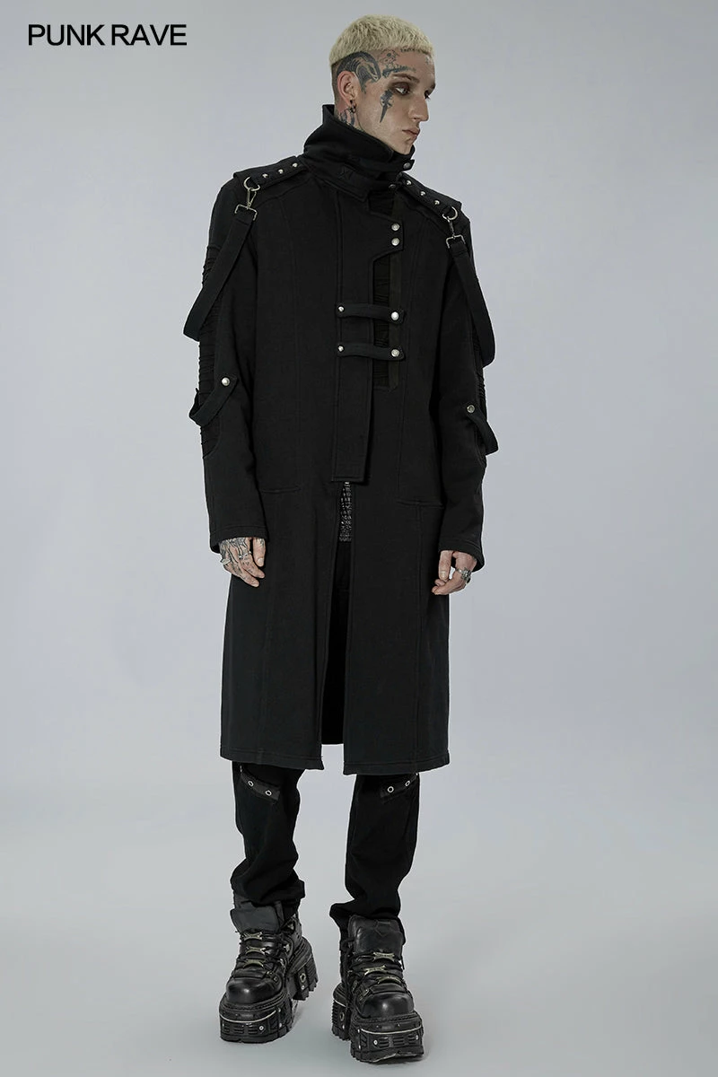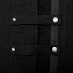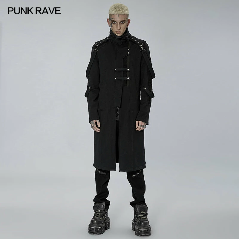 Versatile statement black long military style jackets from Punk Rave with metal hardware and strap detailing. Made from a soft cotton fabric featuring asymmetric high collar, this coat looks amazing on everyone. Easy to match with anything and will keep you warm through the colder months.