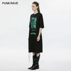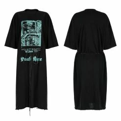 Awesome long oversized T-shirt style black dress from Punk Rave. Made from a soft fabric fin a relaxed comfortable style with statement contrast print. Features string waist belt if you want to wear it with a gathered in waist style.