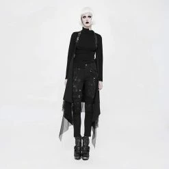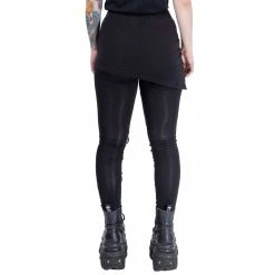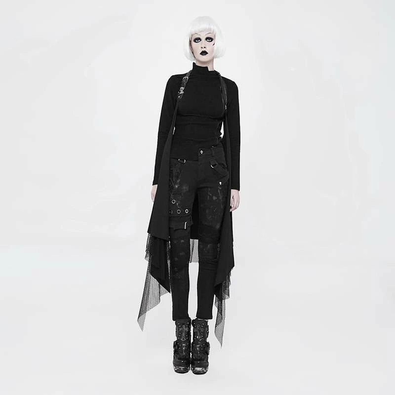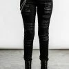 Gothic Post Apocalyptic style women’s black slim fit trousers with rubber prints, distressed mesh details, and belts straps.