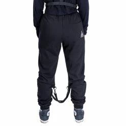 Right thigh and front pocket decorated with woven straps with buckles, D-rings and skull-stud