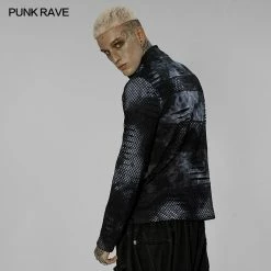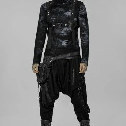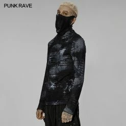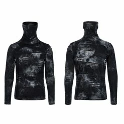 Versatile statement black and gray tie dye long sleeve top from Punk Rave with high neck that has the option to extend up to wear with built in mask with ear holes so it stays up or just wear as a collar. Made from a soft fabric featuring fishnet crochet panels, this top looks amazing on everyone. Easy to match with anything.