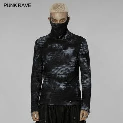 Versatile statement black and gray tie dye long sleeve top from Punk Rave with high neck that has the option to extend up to wear with built in mask with ear holes so it stays up or just wear as a collar. Made from a soft fabric featuring fishnet crochet panels, this top looks amazing on everyone. Easy to match with anything.