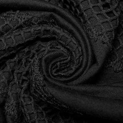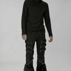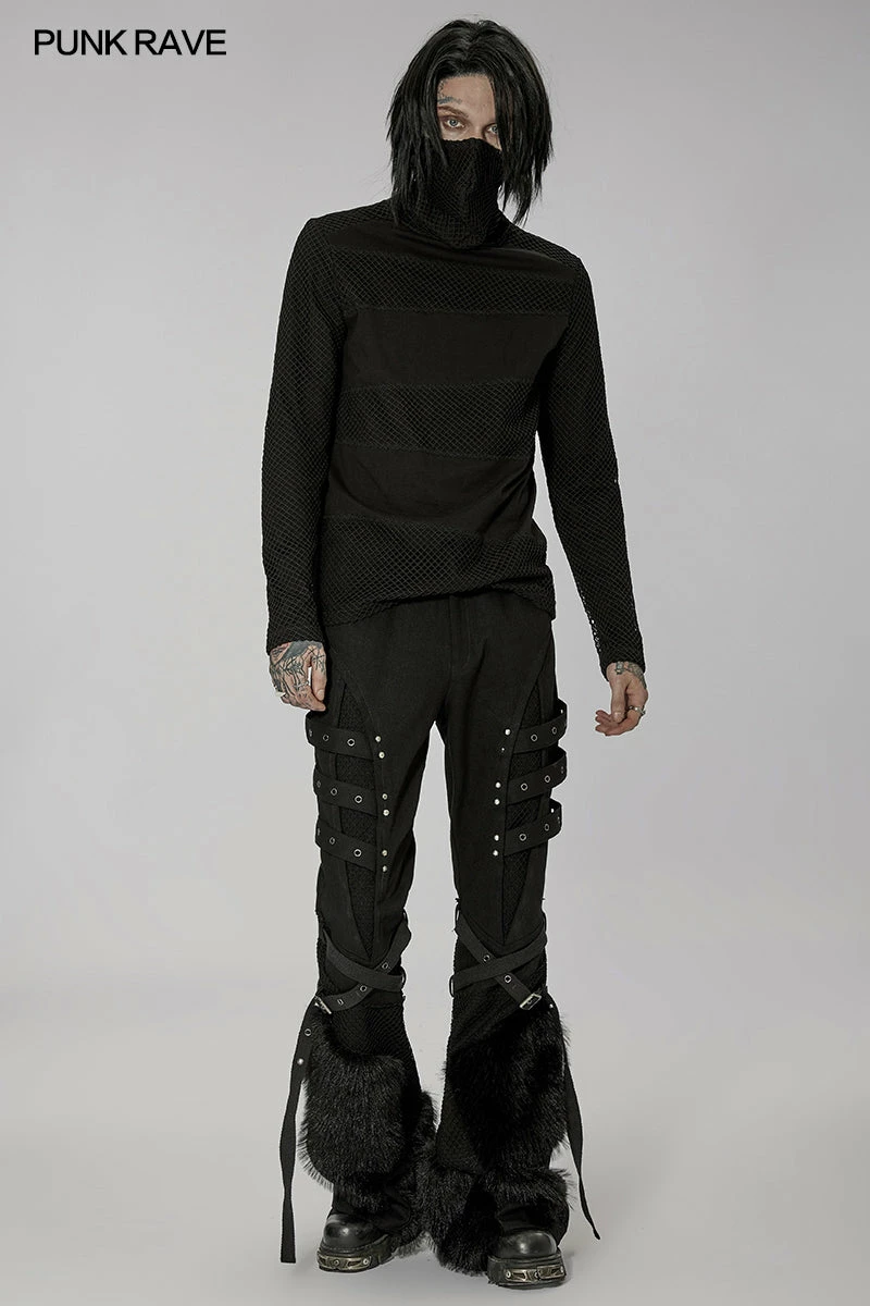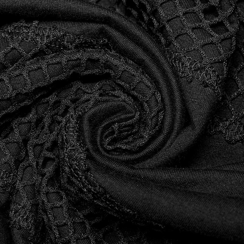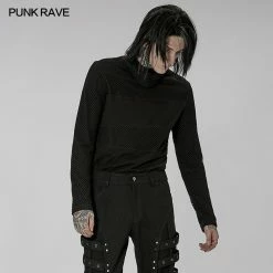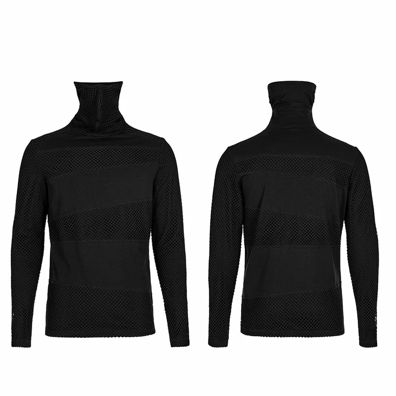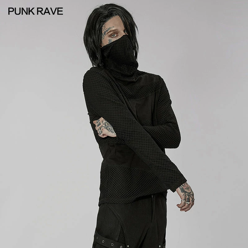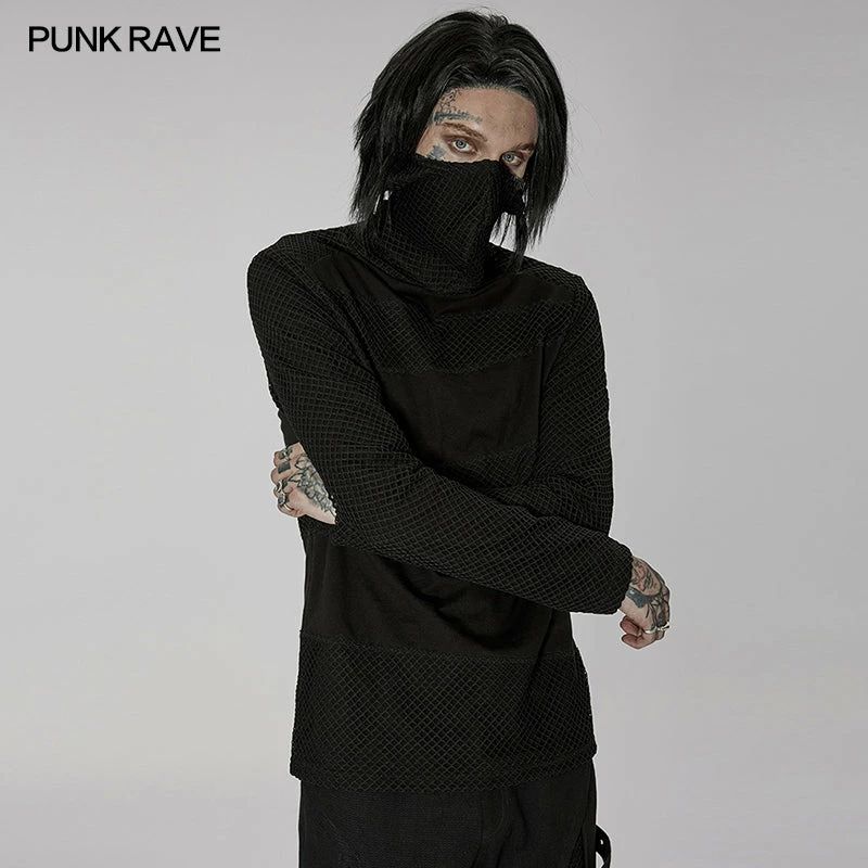 Versatile statement black long sleeve top from Punk Rave with high neck that has the option to extend up to wear with built in mask with ear holes so it stays up or just wear as a collar. Made from a soft fabric featuring fishnet crochet panels, this top looks amazing on everyone. Easy to match with anything.