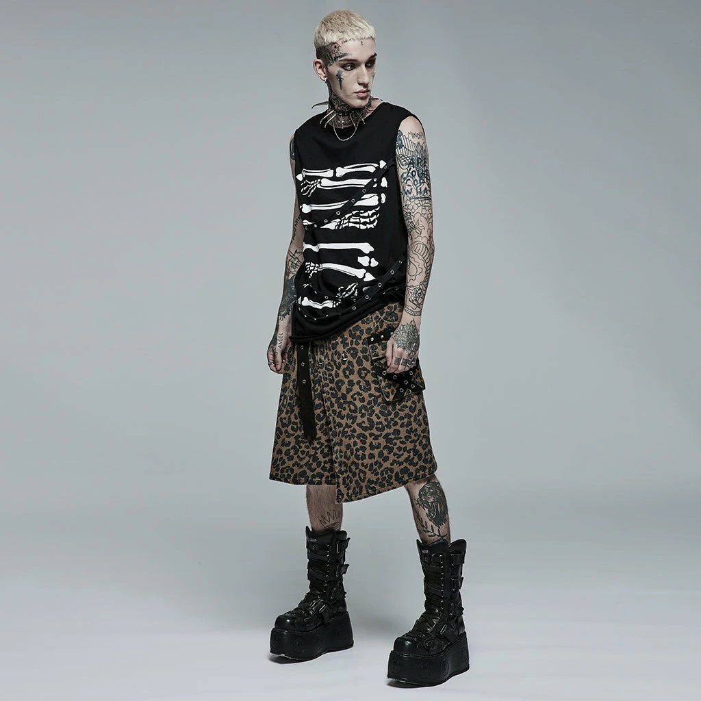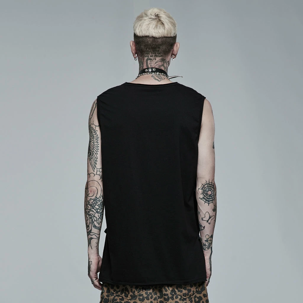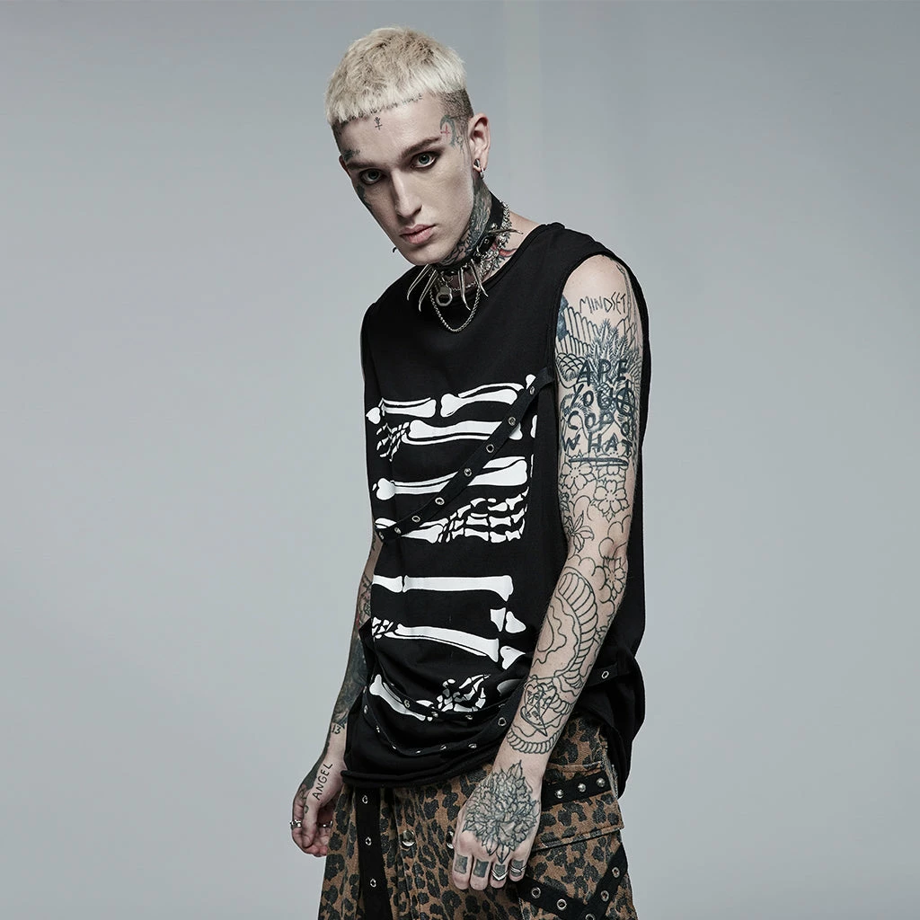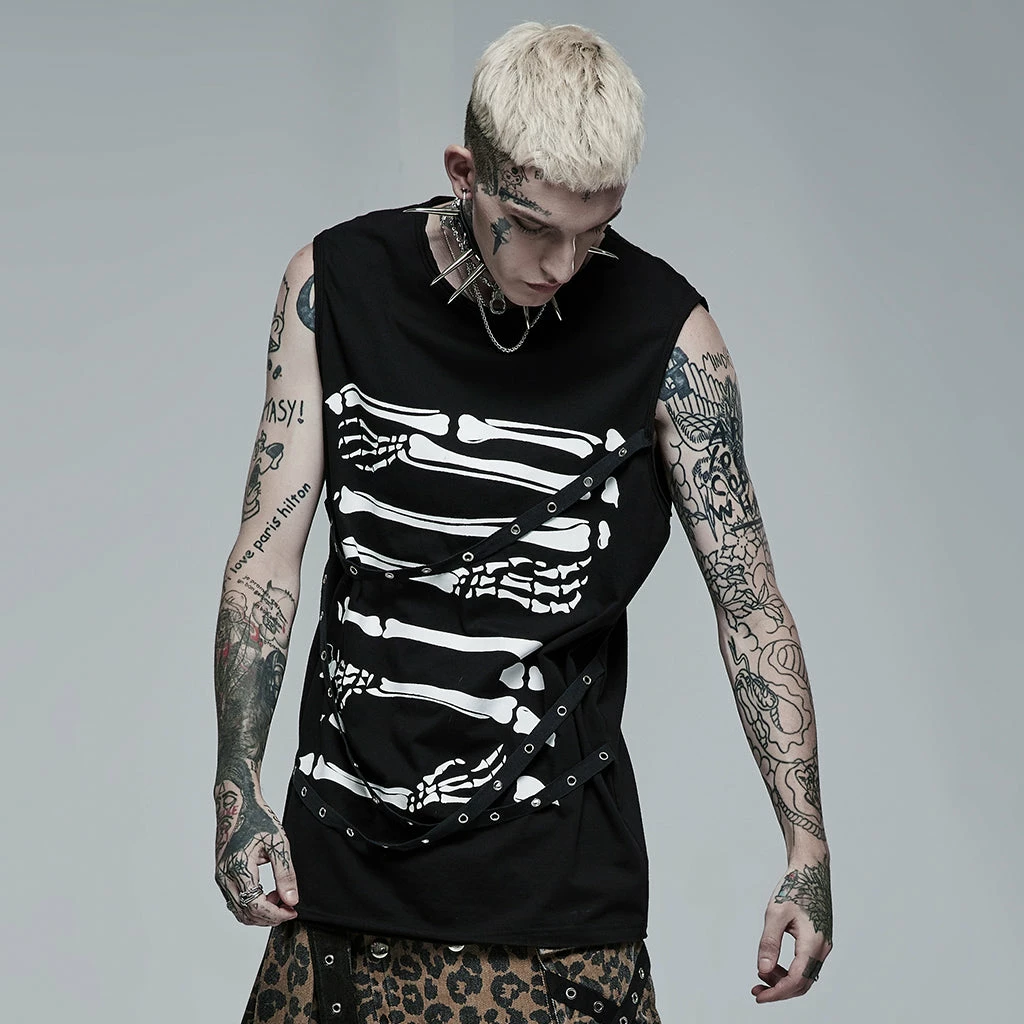 Distinctive black sleeveless t-shirt by Punk Rave featuring a white contrast print of skeletal arm bones. Loose and comfortable to wear in a men’s / unisex style that looks great on everyone.