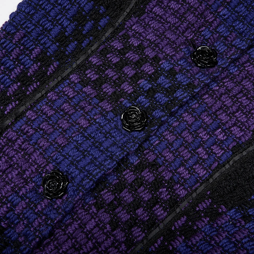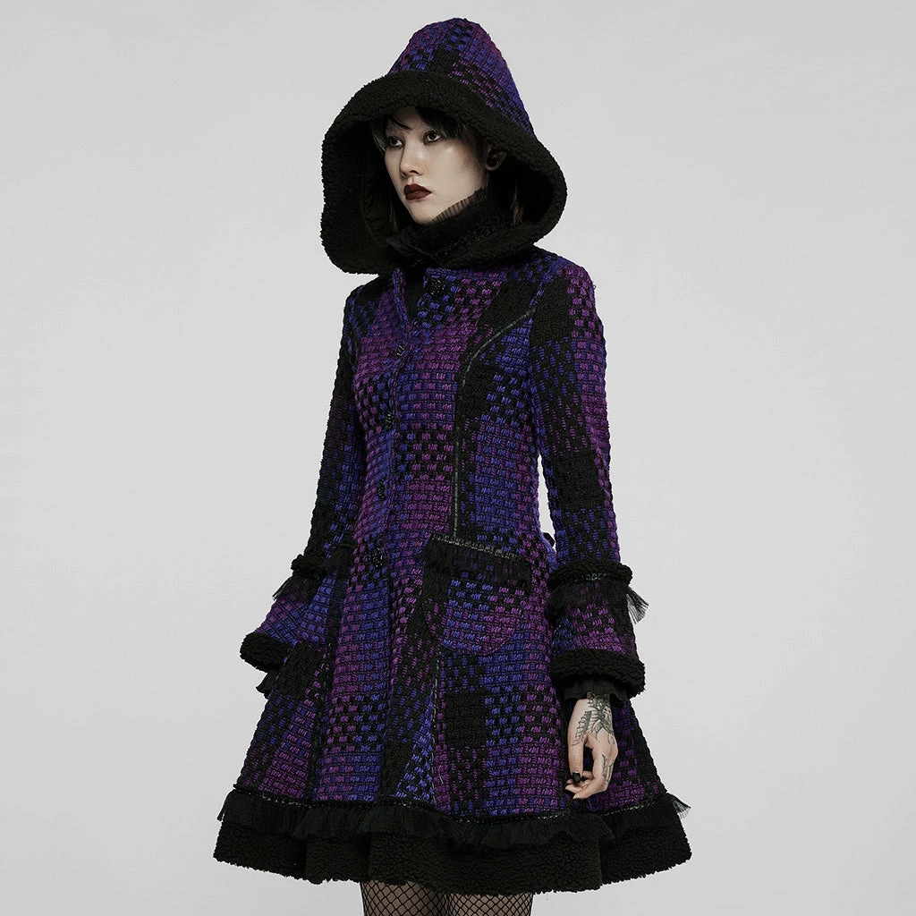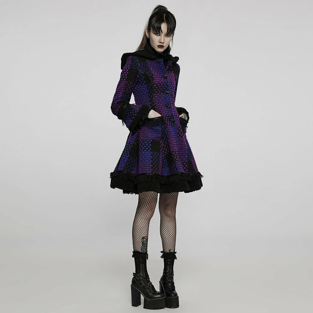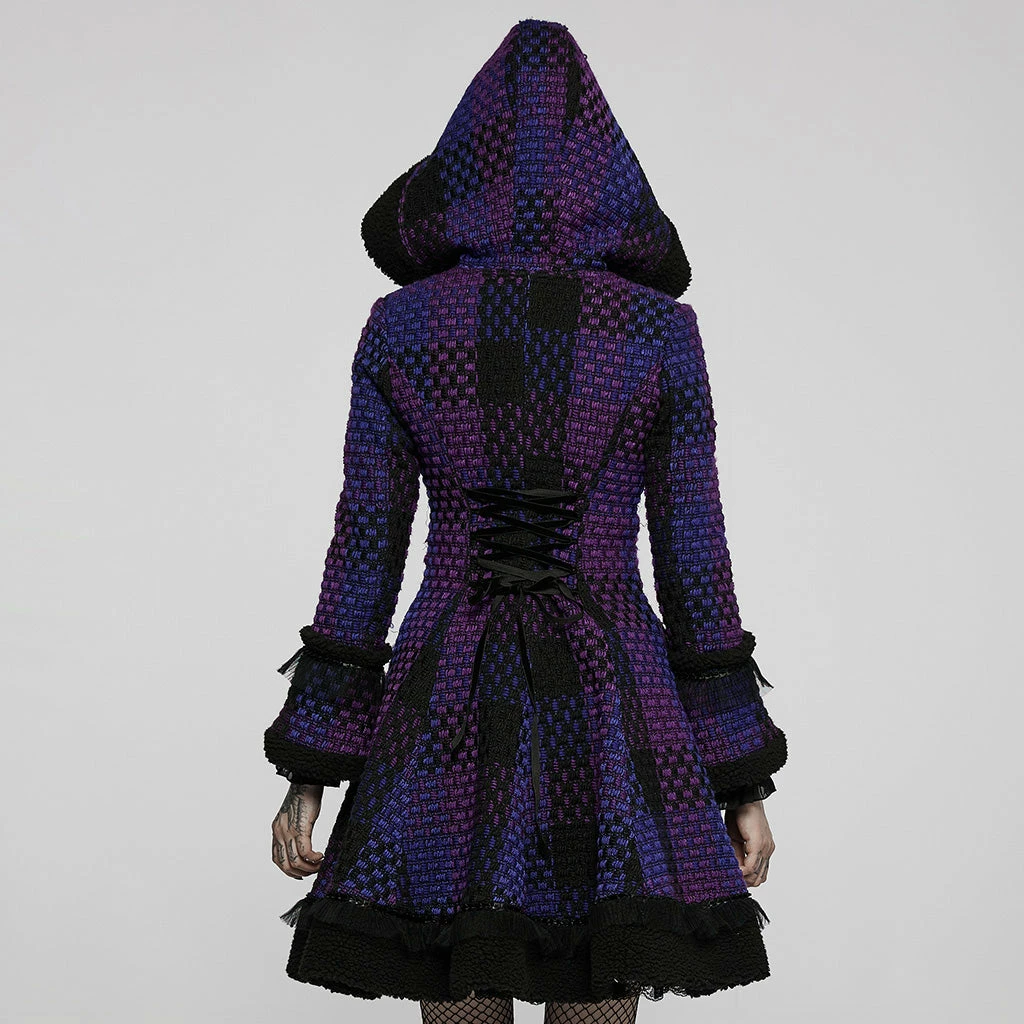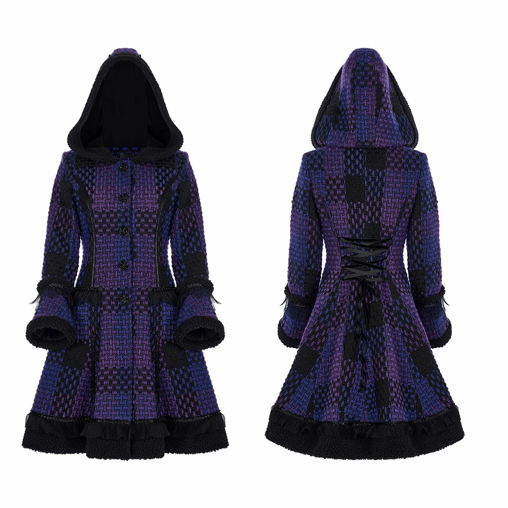 Stunning purple and black checked coat from Pyon Pyon featuring an oversized hood with black faux fur trim, side pockets, lace trims, gorgeous button up front fastening and corset inspired ribbon lacing to the back. With lace trimmed princess seams and fully lined, make this your winter wardrobe must-have.